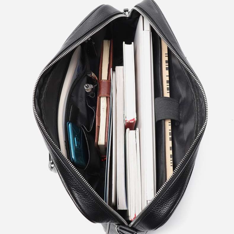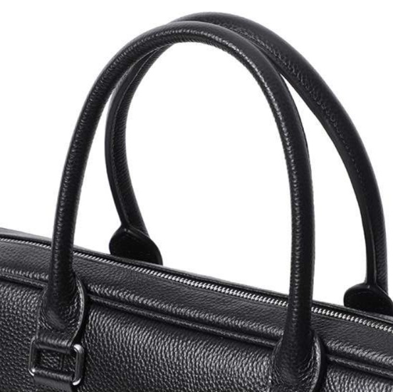 シボ加工が施された本革を使用した高品質のブリーフケース。耐久性に優れ、ビジネスシーンにふさわしい洗練されたデザインが特徴です。豊富な収納スペースを備え、書類やデバイスを整理しやすく、移動中もスタイリッシュに持ち運べます。上品なレザーの質感が、あなたのプロフェッショナルな印象を引き立てます。